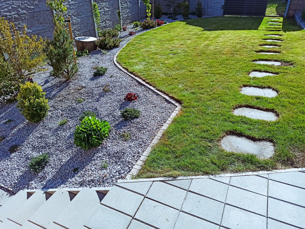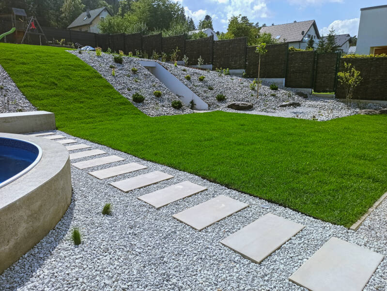 Jednoduchosť, čisté línie a funkčnosť. Kombinácia trávnika, dlažby, betónu, dreva a menšieho počtu rastlín vytvára elegantný, súčasný vzhľad.