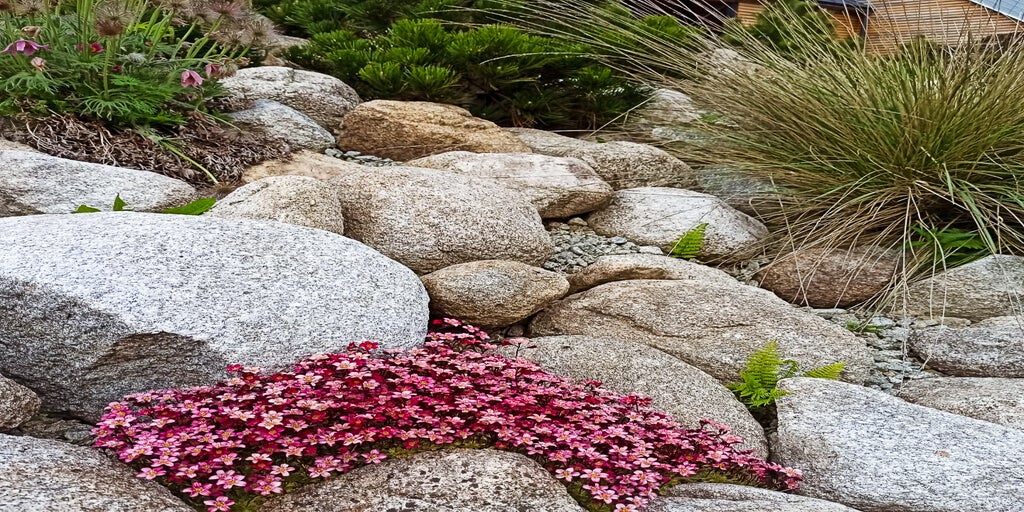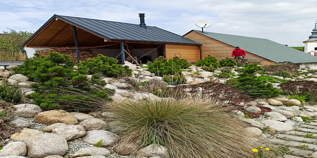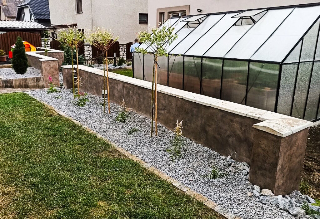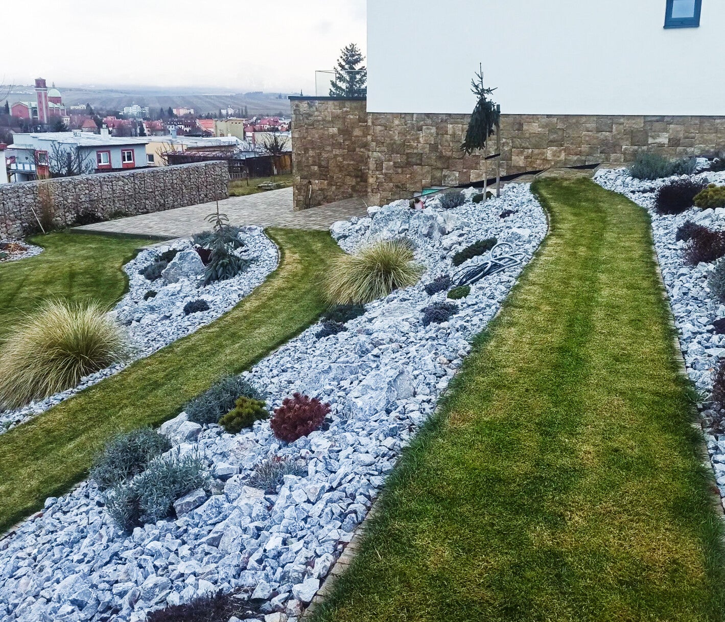 Jedlá záhrada so žulovým múrikom a rozchodníkovým chodníkom